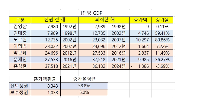 역대 정권 1인당 GDP 상승 통계