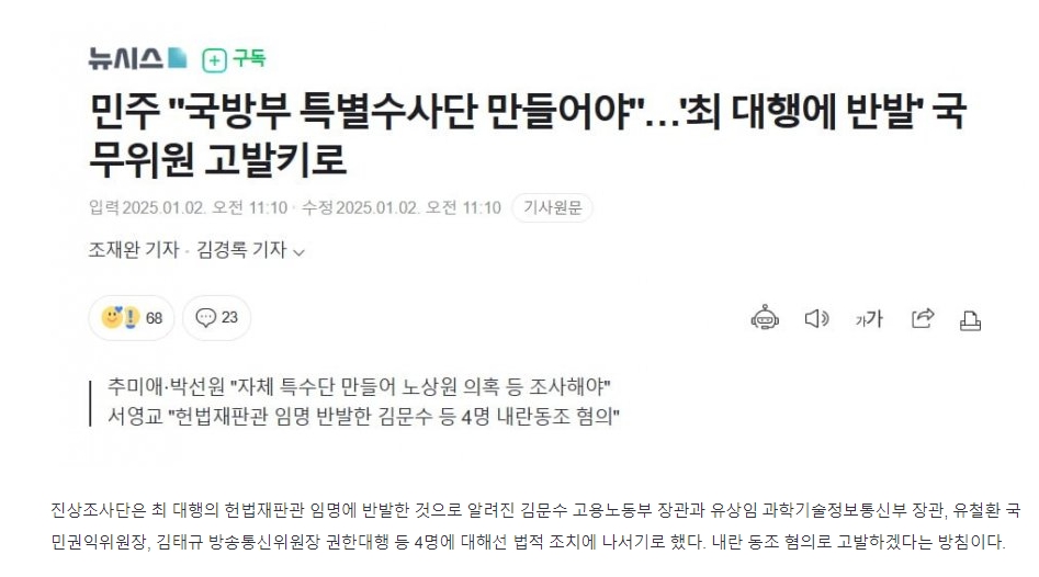 민주당 - 재판관 임명 반발 국무위원 4명 고발 예정