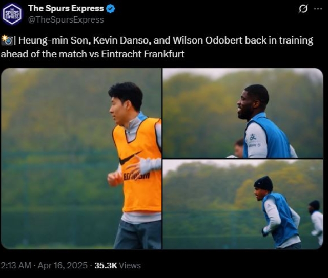토트넘 전문 매체 '더 스퍼스 익스프레스'는 16일(한국시간) 자신의 사회관계망서비스(SNS)를 통해 "손흥민이 케빈 단소, 윌송 오도베르와 함께 훈련에 복귀했다"고 보도했다.