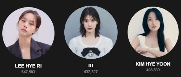 현재 혜리는 64만 표를 돌파하며 1위에 올랐다. 그 뒤로 아이유 43만표, 김혜윤이 40만표로 그를 뒤쫓고 있다.