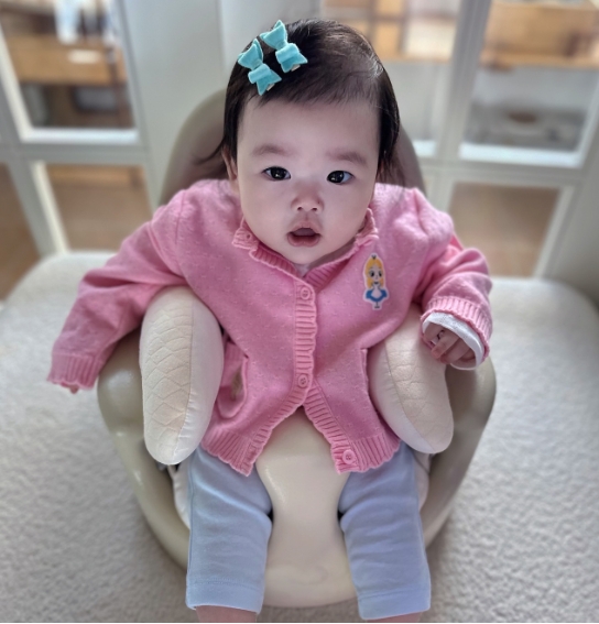 공개된 사진 속에는 박수홍 부부 딸이 아기 의자에 앉아 놀고 있는 모습이 담겨 있다. 귀여운 핑크색 가디건을 입은 재이 양의 모습이 너무 예뻐 보는 이에게도 흐뭇한 미소를 짓게 만든다.
