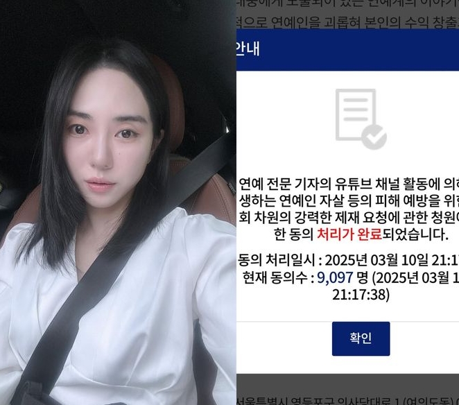 권민아는 지난 10일 인스타그램에 '연예 전문 기자의 유튜브 채널 활동에 의해 발생하는 연예인 자살 등의 피해 예방을 위한 국회 차원의 강력한 제재 요청' 청원에 동의한 뒤, 처리가 완료됐다는 인증 사진을 게재했다.